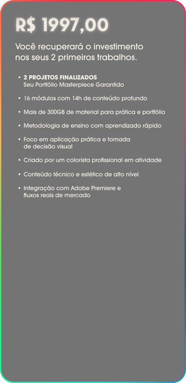 Dois projetos completos de color grading feitos com orientação profissional, mais de 300GB de material bruto para praticar e um portfólio de respeito pra mostrar ao mercado — tudo isso com um workflow sólido, técnico e criativo.Vou aprender só teoria ou também colocar a mão na massa?